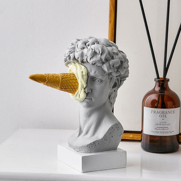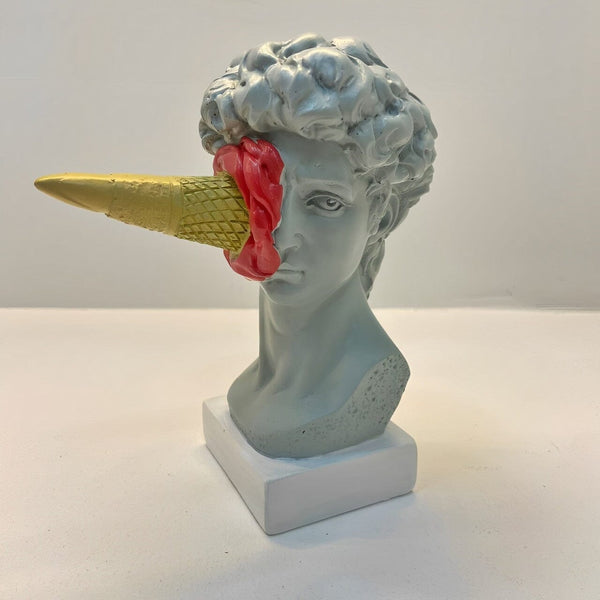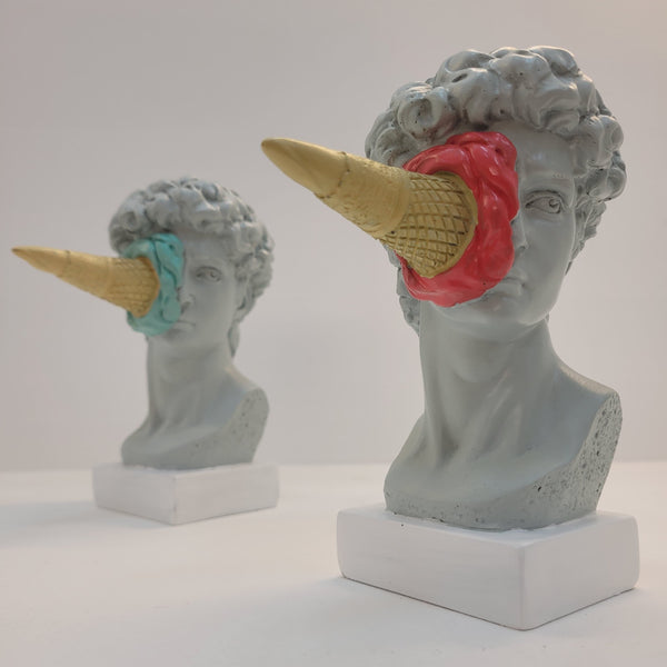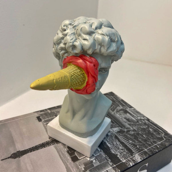 Conheça a extraordinária Escultura Criativa Grega de David por Michelangelo, uma fusão única entre a arte clássica grega e a doçura irresistível do sorvete. Delicie-se com os detalhes primorosamente esculpidos dessa criação gelada e mergulhe na história da Grécia Antiga com um toque moderno e refrescante. David é uma das esculturas mais famosas do artista renascentista Michelangelo. Esta versão buscou mixar a seriedade da peça David com criatividade e modernidade, deixando a peça mais leve de descontraída. Cai bem em qualquer ambiente e proporciona harmonia entre os móveis e objetos decorativos, além de estimular criatividade e proporcionar o efeito de quebra de estresse.  Descubra como essa obra-prima única vai encantar seus sentidos e adicionar um toque artístico inigualável à sua vida. Garanta já a sua escultura e deixe-se envolver pela magia de David de Michelangelo! Material: Resina Medidas: Cuidados: Para manter utilize um pano macio como os de microfibra, que não deixa fiapos na peça. Recomendamos a limpeza pelo menos uma vez por semana, para evitar o acúmulo de resíduos. Se for necessária uma limpeza mais profunda, utilize um pano umedecido com álcool e retire o excesso com pano seco e macio.