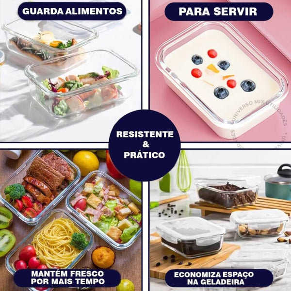 🔥 Vidro resistente + tampa com trava em 4 pontosPode ir ao micro-ondas, freezer e lava-louças sem perder qualidade.